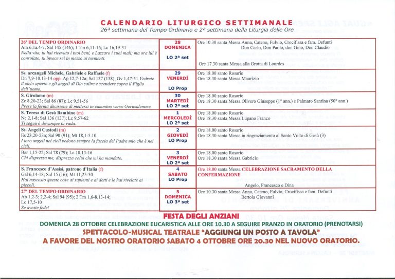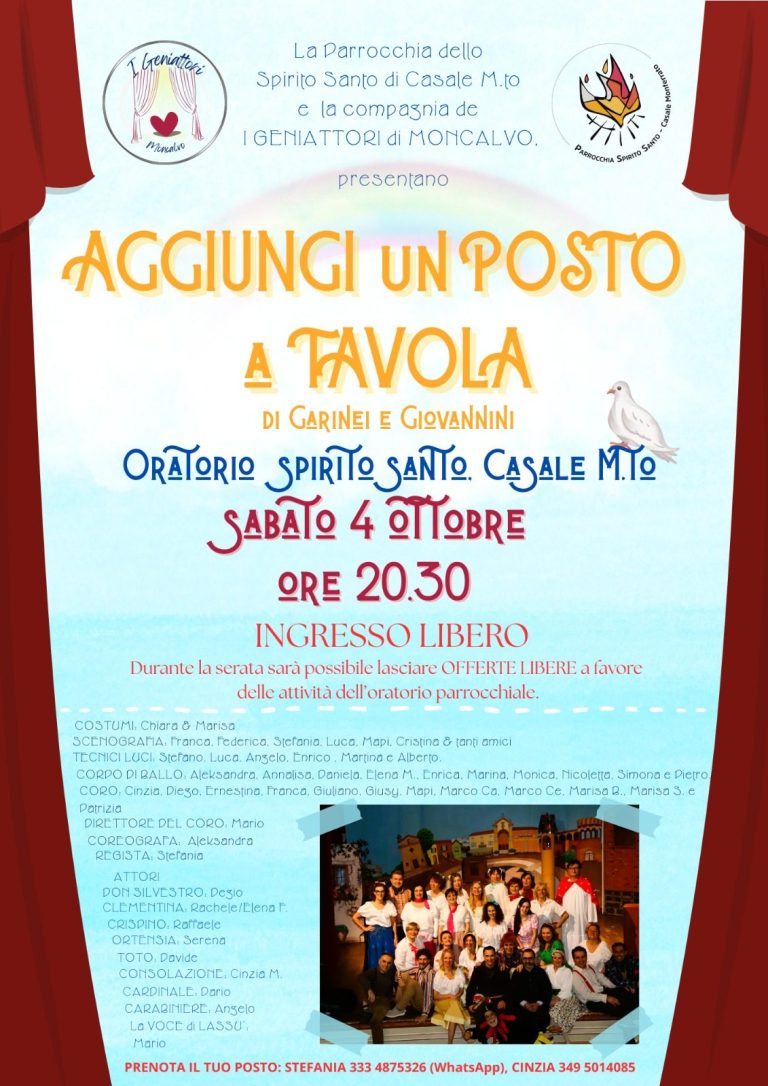 Sabato 4 ottobre i ragazzi di terza media che hanno concluso il cammino catechistico riceveranno da S.E. mons. Gianni Sacchi, il Sacramento della Confermazione e nella serata seguirà in Oratorio il musical "Aggiungi un posto a tavola". La Compagnia de I Geniattori di Moncalvo, che presenta sul territorio lo spettacolo sempre a fini benefici, questa volta lo farà per il nostro Oratorio.